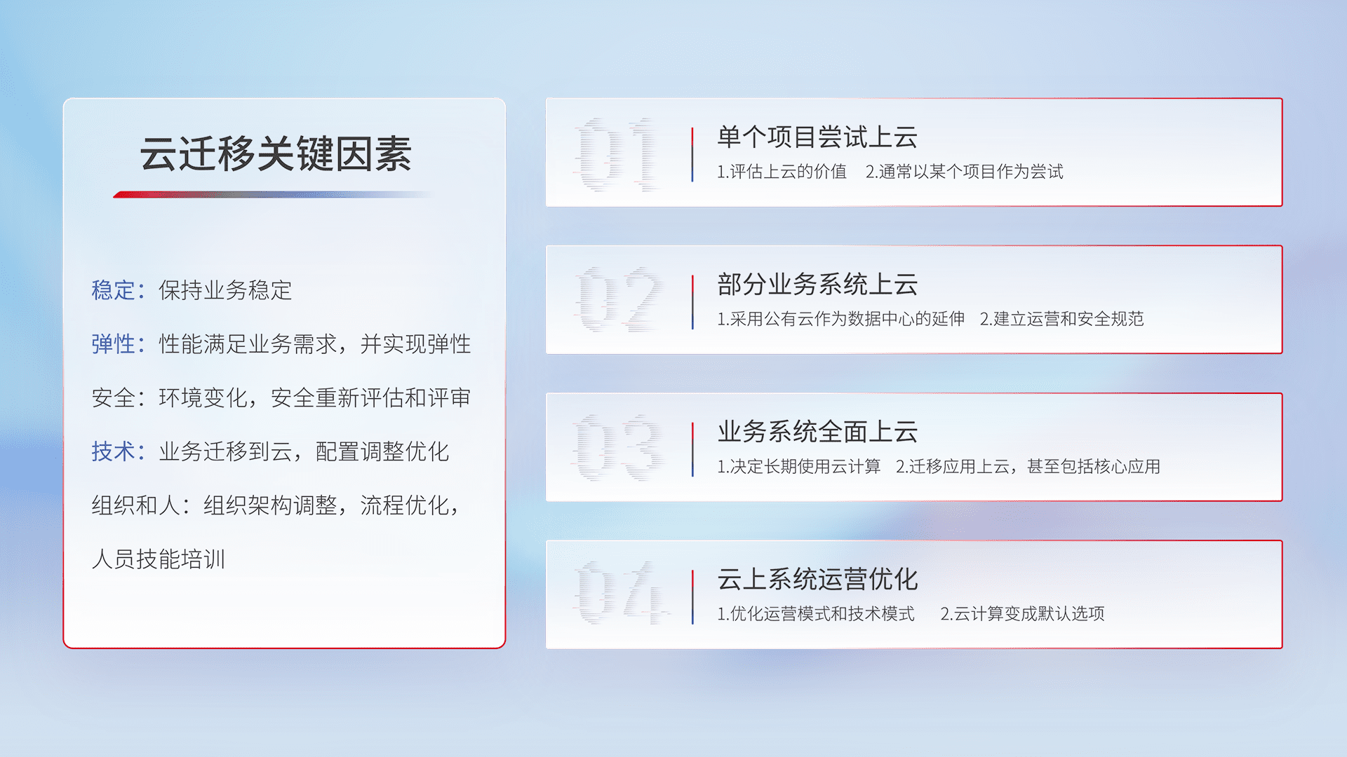 结合实际业务,,,,从规划设计、、、、云平台选型、、、、云原生改造、、数据迁移、、、、集成交付,,,,迁移全过程为客户识别最佳上云路径,,,,做好风险识别管理,,设计网络架构、、、、身份权限、、、安全审计合规、、、操作审计、、、日志审计、、、、监控告警策略、、、、多站点容灾设计等,,对云上基础设施进行整体规划,,,提升IT治理水平,,,,以满足弹性、、、、高可用、、高性能的需求。。。。