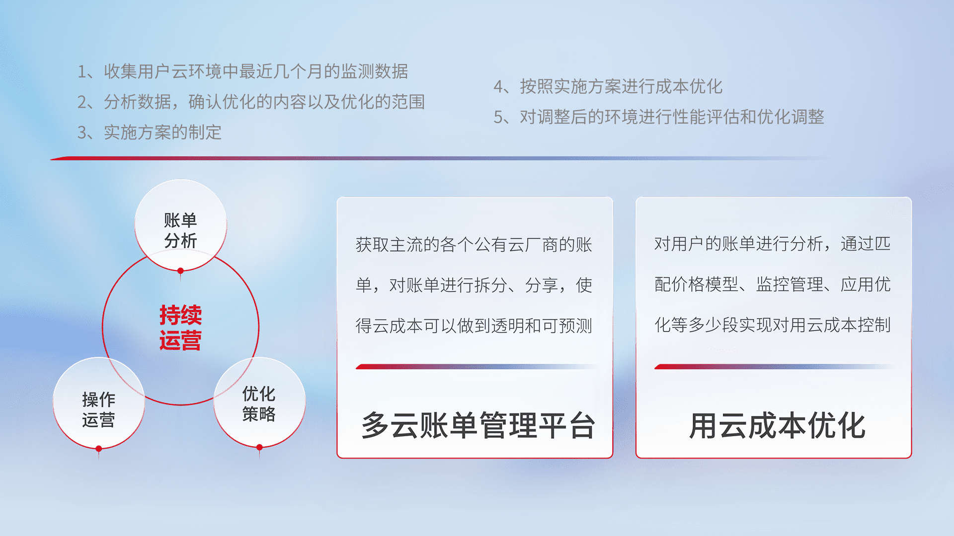 通过多云纳管,,,以统一的资源数据模型把客户的云资源进行抽象和封装,,,,进而实现对多云资源的统一操作,,,,保障云资源管理的可靠性、、、稳定性与可用性。。。量身定制化运维内容,,,,配置、、开发运维、、、、补丁管理、、、备份、、、、监控、、、认证和访问管理、、、审计和日常巡检等,,,保障在用云过程中的可靠度,,稳定度以及高可用率。。。