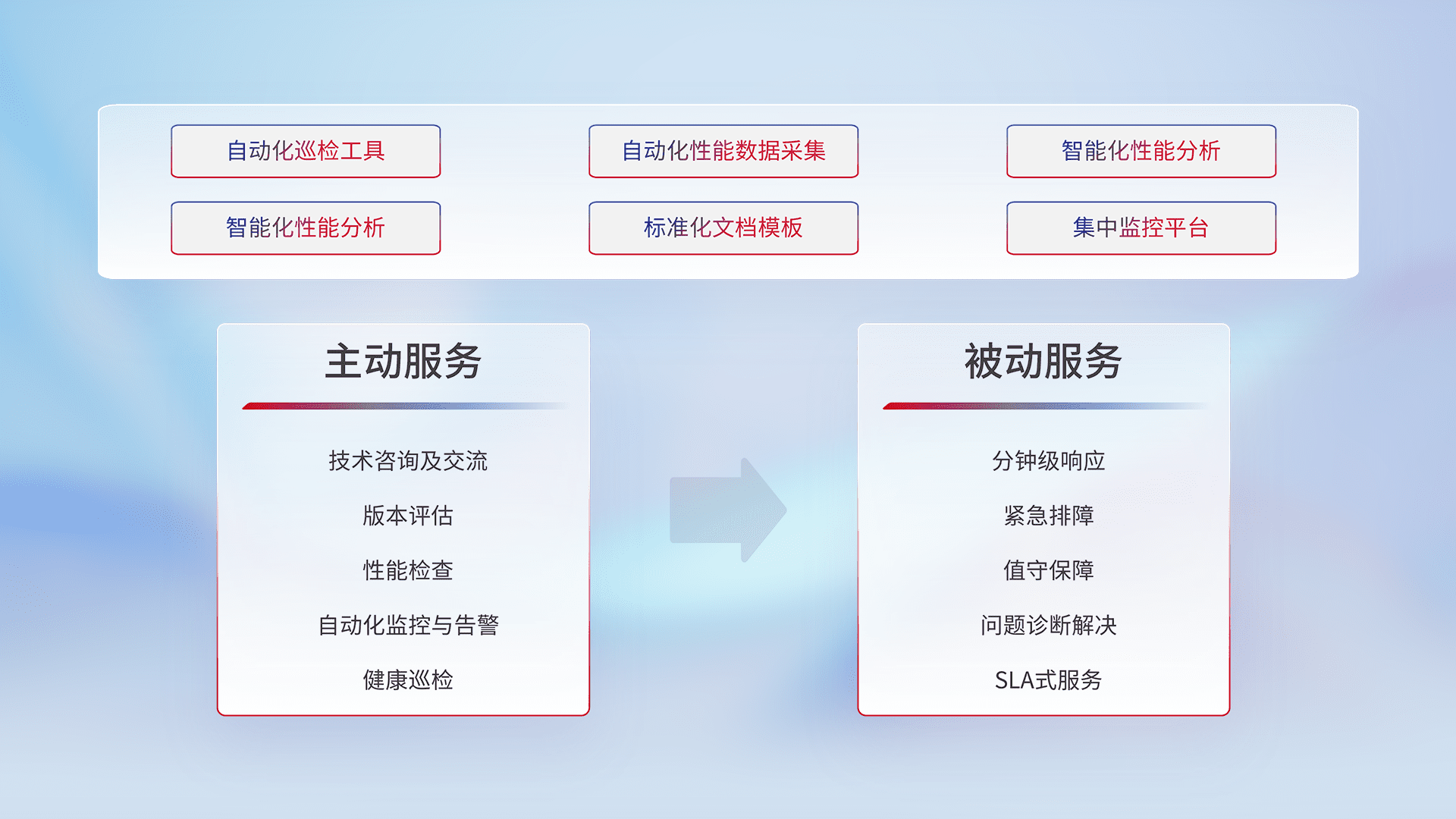 智能化工具和标准化文档,,,保障服务质量,,提供主动服务(包含技术咨询、、、版本评估、、、性能检查、、自动化监控与告警、、、、健康巡检)和被动服务包含(分钟级响应、、紧急排障、、、、值守保障、、、问题诊断解决、、SLA服务)。。。